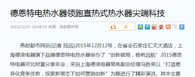 2015年12月12號,在省會石家莊匯文大酒店,上海德凌電器旗下品牌德恩特電熱水器舉辦了“創(chuàng)新破局,楊帆遠航”2015德恩特電器河北財富分享年會